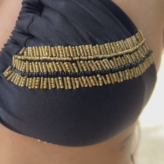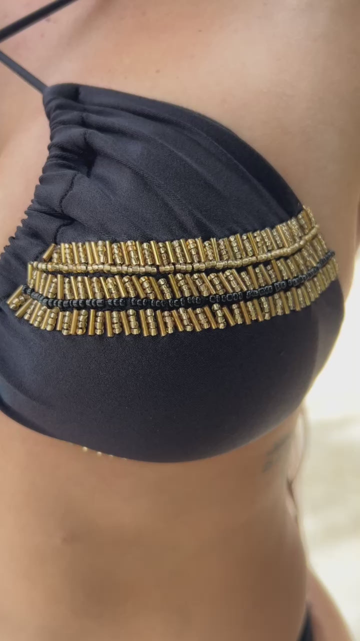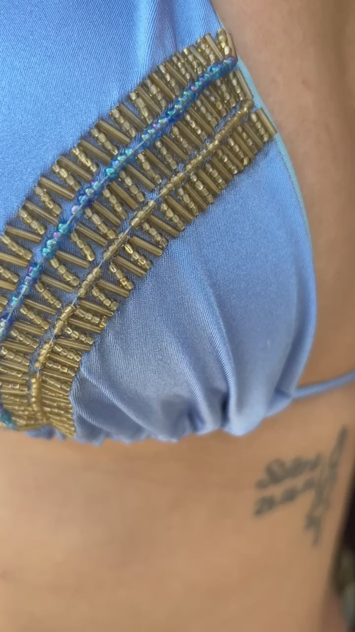 Traje de Baño de 2 prendas Top tipo triangulo con detalles bordados a mano en pedrería de Lujo, con copas almohadilla removible. Panty de anudar a lo lados en brasilera o tanga normal con detalles de bordado en la parte de adelante. Horma espectacular. Completamente Forrado, No se transparenta.